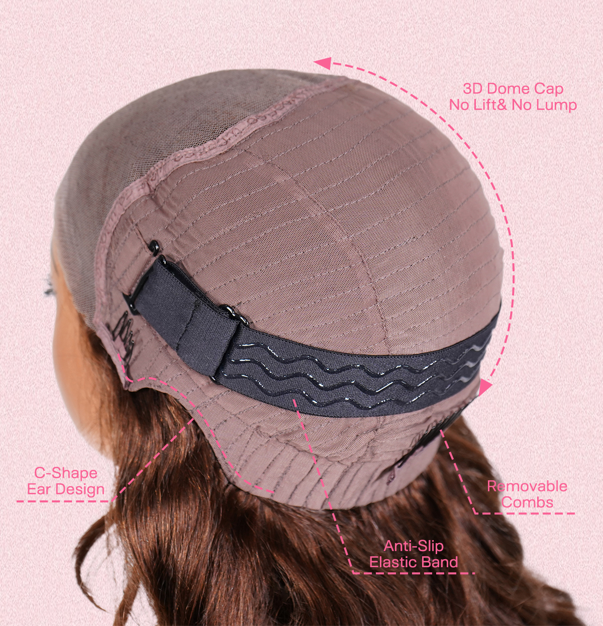 | Wig Cap | Medium size cap (about 22.5 inches), Removable combs, 3D Dome cap with elastic band |