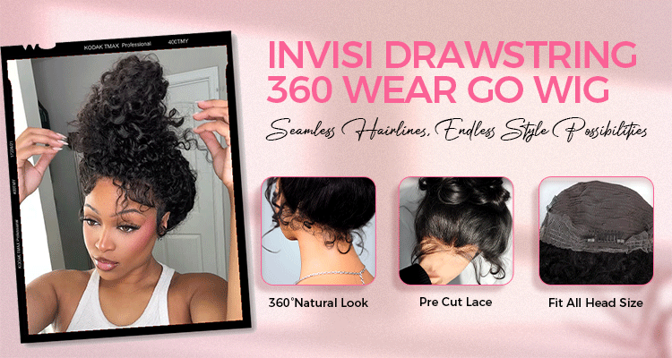 OhMyPrettyWig 360 lace wear go wig collection has a sheet of loop lace around your wig base, creating a 360° natural and perfect hairline for buns and ponytails. 360 glueless lace wigs have straight, water wave, body wave, and kinky straight textures. Natural black and highlight brown 360 lace wigs are available. A pre-cut lace, pre-bleached knots, and a pre-plucked hairline of 360 glueless wigs are friendly to wig beginners and busy girls.