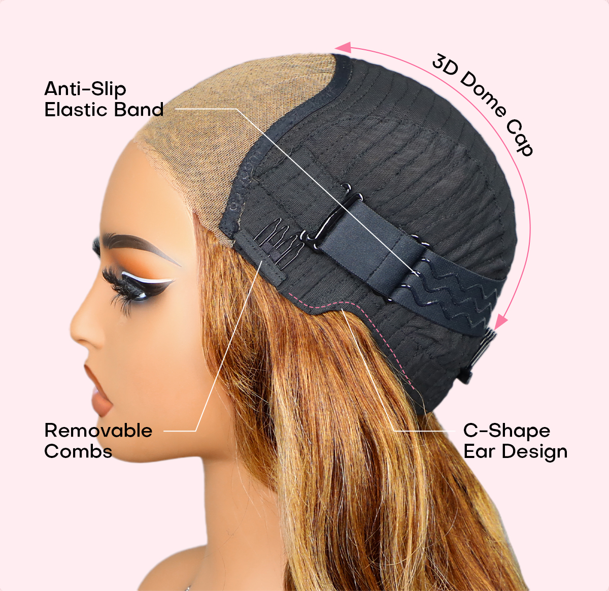 | Wig Cap | Medium size cap (about 22.5 inches), Removable combs, 3D Dome cap with elastic band |
